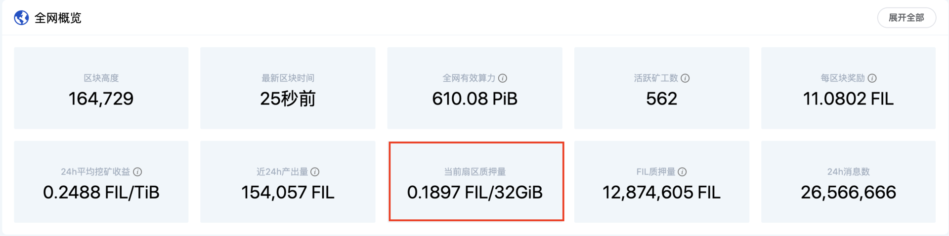 根据filfox.info的最新数据,当前扇区抵押量为0.1897 FIL/32GiB,基础手续费为0.0001 FIL。