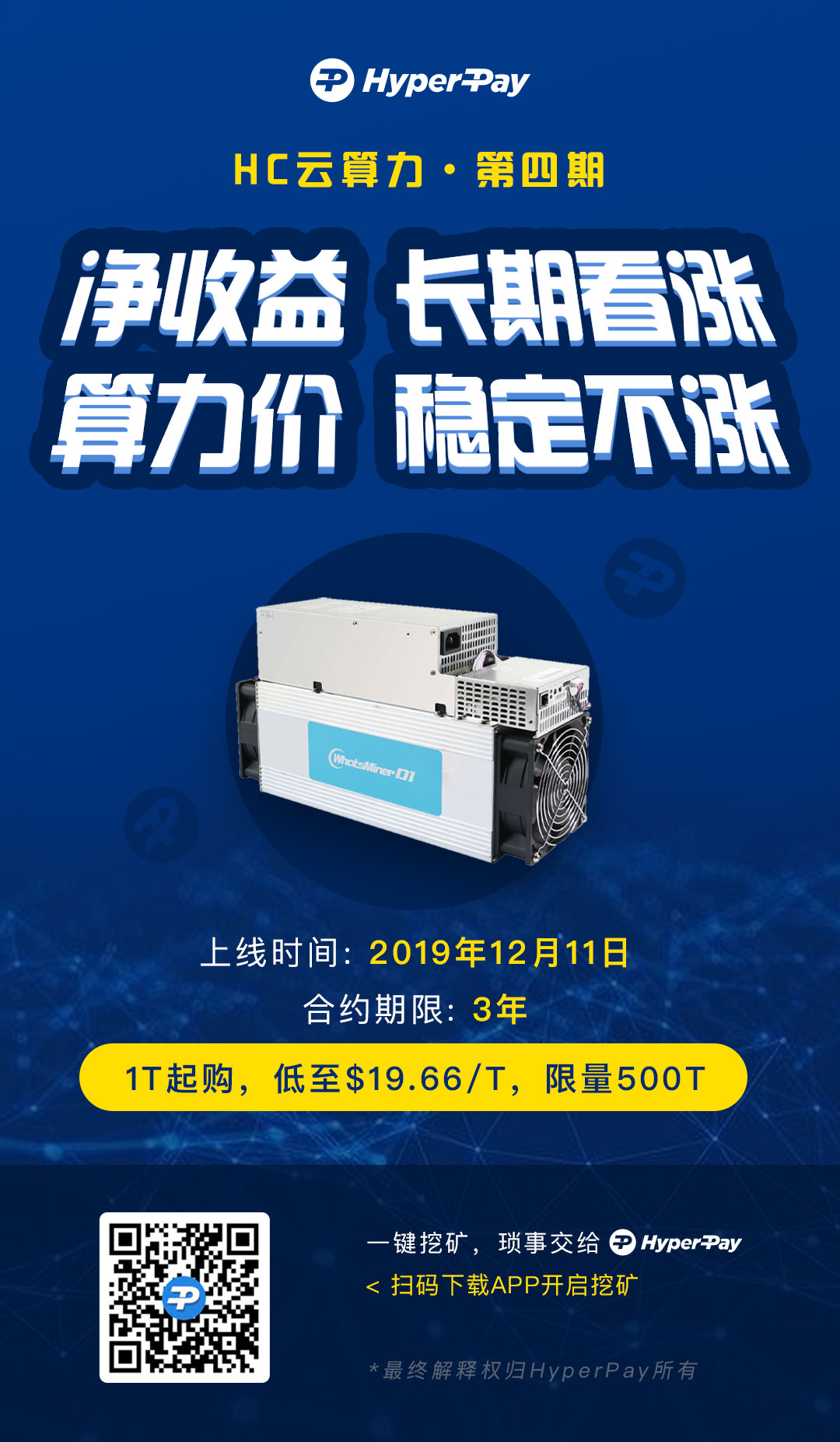 HyperPay于2019年12月11日隆重上线HC云算力合约第四期。HC云算力挖矿能免除个人挖矿带来的:难选优质矿机、大量资金投入、挖矿噪音吵闹、后期运维繁琐等缺点。